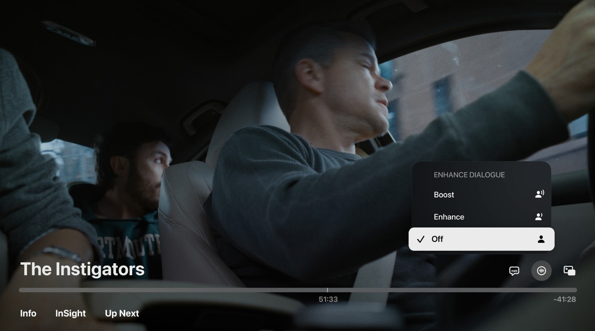 Una de las características que mejoró fue Mejorar el diálogo. Utilizando aprendizaje automático y audio computacional, aclara las voces para que no te pierdas ninguna conversación en películas o series. Funciona en Apple TV 4K y reproduce sonido desde su HomePod, parlantes integrados, AirPods u otros auriculares inalámbricos.