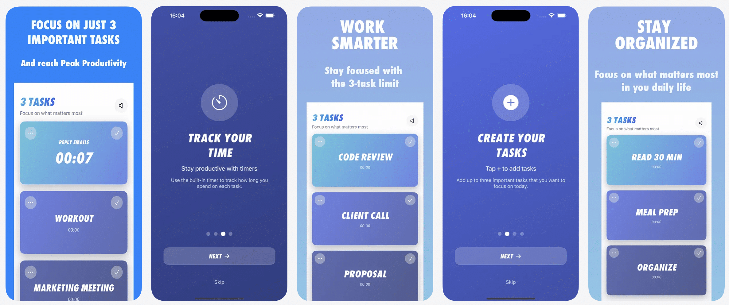 La mayoría de las aplicaciones de tareas pendientes te abruman con listas interminables. 3 tareas diarias lo mantiene simple: elige las tres tareas más importantes y realízalas.