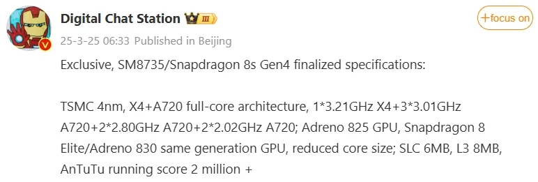 La revelación oficial debe aclarar todos los detalles y confirmar que el nuevo chip realmente se llamará Snapdragon 8s Gen 4Pero parece que nos enfrentamos a una solución poderosa para dispositivos premium más asequibles.