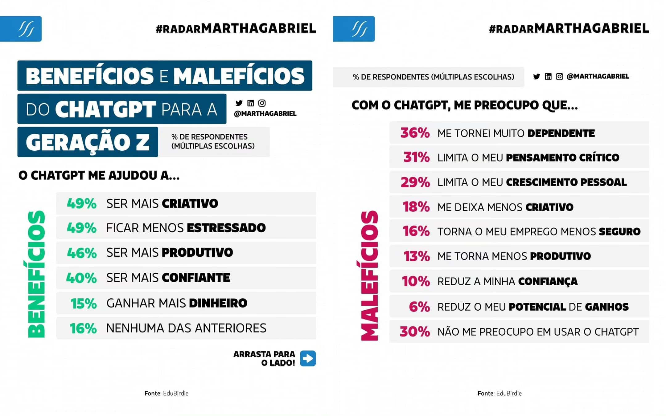 El primero se refiere a una encuesta realizada en todo Brasil, denominada “FUTURO del TRABAJO 2024: dónde estamos y hacia dónde vamos”, por Futuros Possíveis en colaboración con el Grupo Boticário. La mayoría descarta perder su trabajo “por culpa de un robot”, pero revelan que su mayor temor es ser reemplazados por otros profesionales que entiendan más de tecnología. Entre otros datos, al 47% le cuesta mantenerse al día con los cambios tecnológicos. ¿Estás de acuerdo?