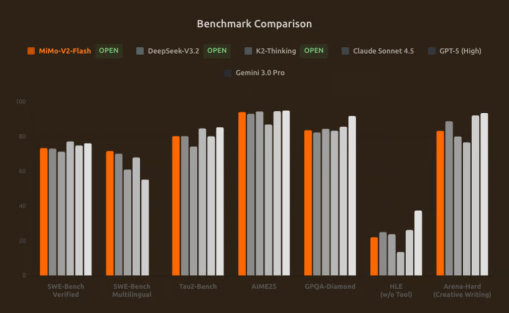 En las pruebas comparativas realizadas por el fabricante, el MiMo-V2-Flash presenta un rendimiento competitivo en tareas de razonamiento en comparación con los modelos chinos Kimi-K2 y DeepSeek-V3.2. Sin embargo, en evaluaciones de razonamiento más complejas, el sistema todavía está por detrás de Gemini 3.0 Pro y las versiones avanzadas de OpenAI, aunque se acerca a ChatGPT 5.0 en algunas categorías.